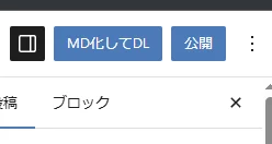 このカスタマイズを行うと、以下の画像のように、投稿編集画面の右上に「MD化してDL」という便利なボタンが追加されます。