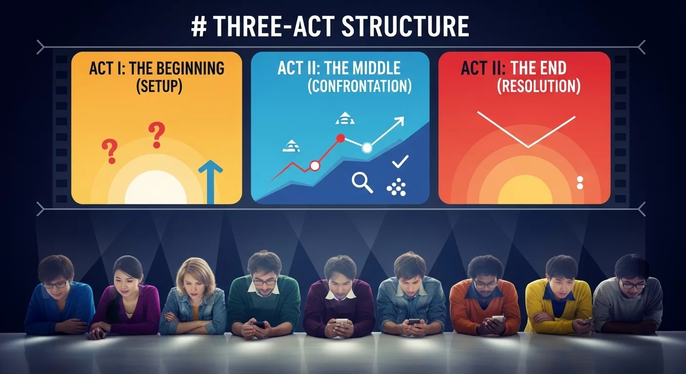 あなたの動画を、以下の3つのパート(幕)に分けて設計することで、視聴者の集中力と興味を最後まで持続させることができます。